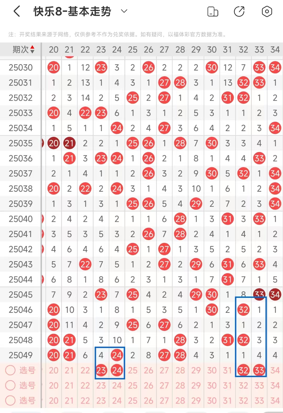 21-30区;上期该区间开出4码趋势,本期该区间看好开出2码左右,23,24形成一个小三角形态号码走势,该区间做号范围;23,24.