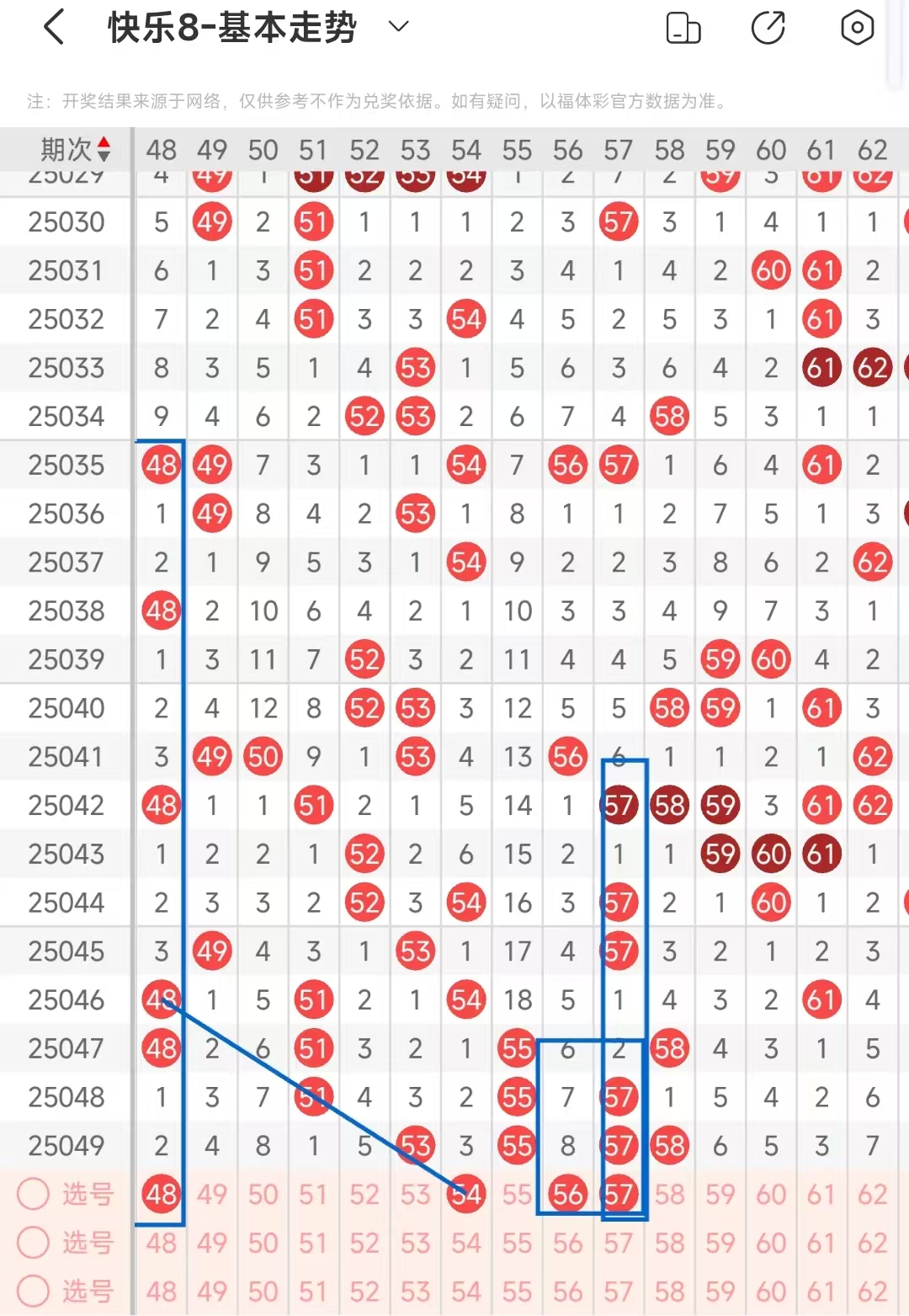 51-60区;上期该区间开出4码趋势,本期该区间看好开出3码左右,54形成一个间隔1期的三斜连走势号码,56,57形成一个L字形态号码走势,57形成一个123重的号码走势,该区间做号范围;54,56,57.