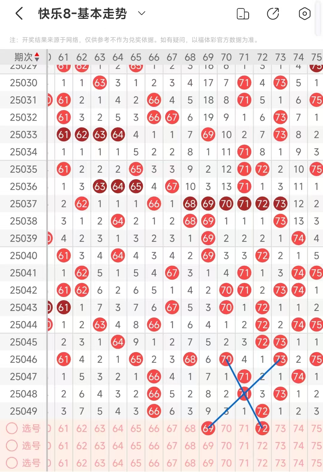 61-70区;上期该区间开出1码趋势,本期该区间看好开出1码左右,69形成一个间隔1期的奇数三斜连走势号码,该区间做号范围;69.