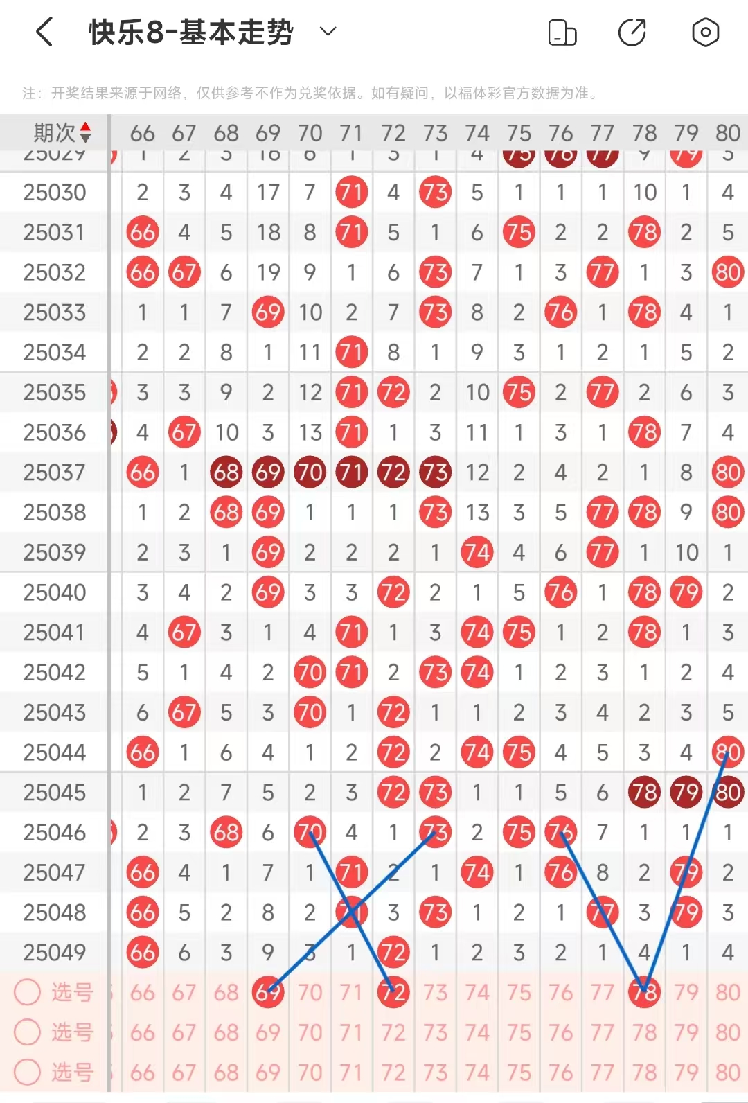 71-80区;上期该区间开出1码趋势,本期该区间看好开出2码左右,72形成一个间隔1期的三斜连走势号码,78形成一个间隔1期的三斜连走势号码,另外还有一条间隔2期的三斜连走势号码,该区间做号范围;72,78.