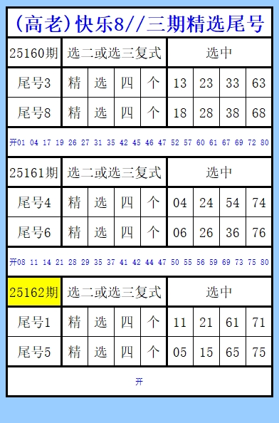 本期看好号码开出的范围是2码规律至4码规律之间。近5期开出重尾号的分别是,25157期尾号0+1+6各出3个、25158期尾号2出5个、25159期尾号0+1+5+7各出4个、25160期尾号7出5个、25161期尾号1+5+9各出3个。看好6期之内重尾号再次开出多码规律,概率在在九成左右。另外重尾号有开出6码的可能性,大家可以筛选一下,本期看好的五个尾号是0、1、5、6尾。
