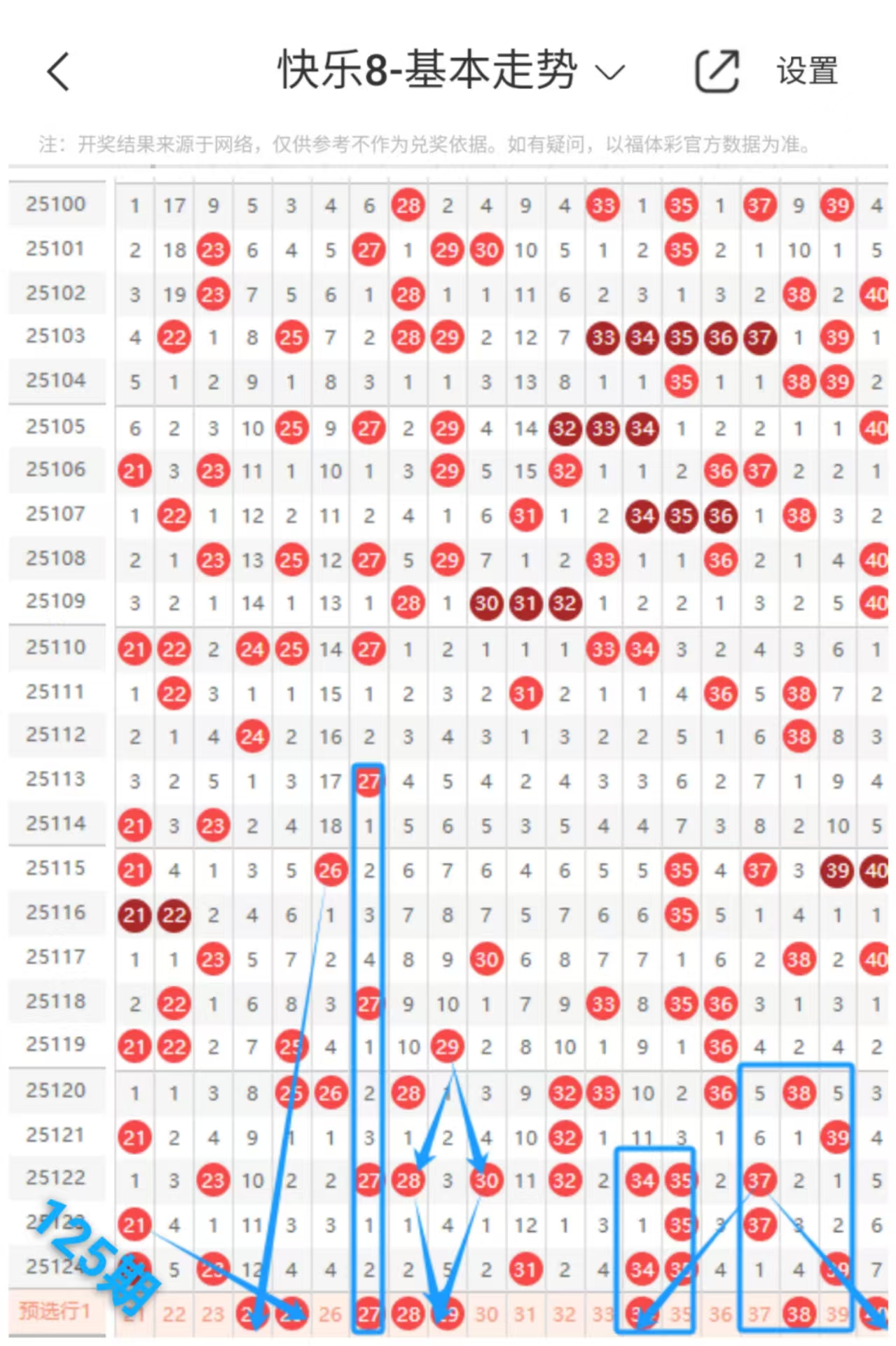 24 25号:这两个号码本期是二选一的下落走势形态的,看好24号顺子跳格斜连对称下落的走势形态的。