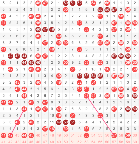 第三区间 首先一样看好龙头位置的 41号码球有机会下落 ,可与42成对子回补下落,再看44 45二选一出号有机会,然后 看重码53以及54都有机会下落,尾部看好一码57和 59的回补 有机会,该区间可推荐的选二搭配组合有41 44或者54 57,第三区间胆码主看41 42 44 54 57