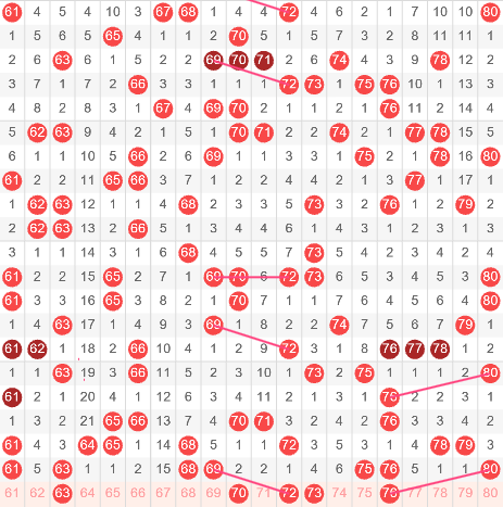 第四区间首先看好一码重码63的下落有机会,再看边码70的下落回补,以及72 73的回补均 有较大的机会 下落,然后看 76的 重码有机会 下落 ,该区间 可推荐的选二搭配组合 有63 73或者70 72.第四区间胆码主看63 70 72 73 76