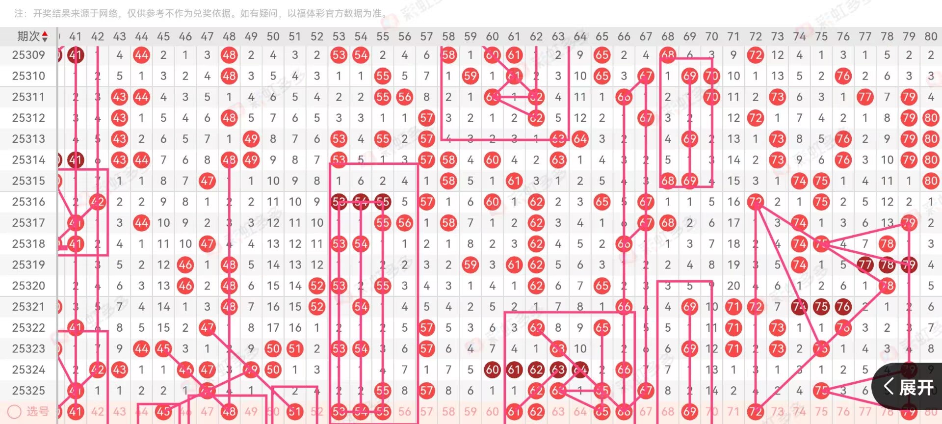 (4)区间分布: 将1-80个号码分为4个区间(1-20,21-40, 41-60,61-80)确保号码分布均匀不扎堆。