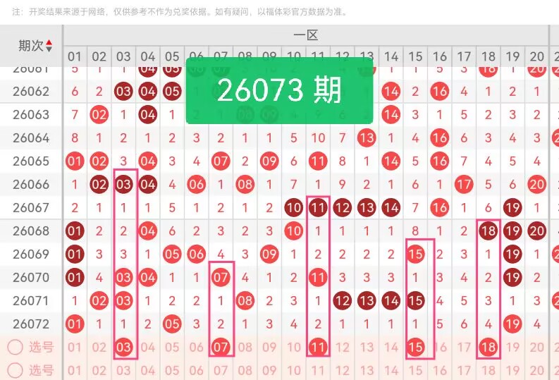上期第一区间开奖3个号码,本期可能会增加开出。03作为1路小号,属于温热号范畴,结合快乐8冷号回补的周期性特征,03具备继续升温潜力;07为2路小号,上期一区无2路号码出号,07直接填补2路缺口,同时其尾数7在一区近5期活跃度不足。11延续上期尾1热势,上期01、51等尾1号码表现活跃,11作为一区尾1代表,承接热尾趋势;15为0路合数,与上期05同属尾5号码,15的选择贴合这一规律;18为2路温号,处于温冷交界,既避免过度追冷,又能借助温号升温趋势增加出号概率。