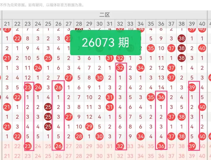 上期第二区间开奖7个号码,本期可能会减少开出。23为2路质数,上期二区22为2路质数,23与23同路且相邻,延续2路质数趋势,处于温冷区间,避免追热过度;26为1路合数,与上期28同属尾8号码,同尾号延续是二区高频出号特征;32为2路温号,二区2路号码上期出号数量较多,但32属于区间内遗漏较久的号码,具备回补需求。36为0路合数,上期30、34等0路号码在二区表现稳定,36承接0路号趋势,强化二区0路出号优势;39为1路质数,上期二区仅22、37两枚质数,质数占比偏低,39填补二区质数缺口,平衡区间内质合比例。