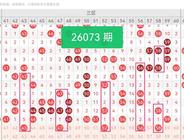 上期第三区间开奖个7号码,本期可能会减少开出。43为1路质数,紧邻上期热号41、44,43借助相邻热号的辐射效应,提升出号概率;47为2路质数,上期三区仅41一枚质数,47填补三区质数缺口,同时47尾7在三区近10期活跃度较低,属于缺口号码,增加出号可能性。52为2路合数,与上期48、50同属中段热号区间,延续中段热号趋势;56为0路合数,承接上期0路尾0、尾4的热势,0路号码在三区近5期出号稳定,56延续这一优势;58为2路温号,处于温冷过渡阶段。