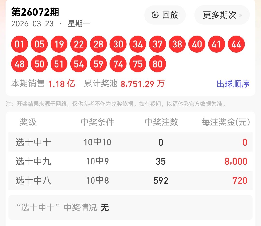 快乐 8 第 26072期已经落下帷幕,开奖号码为:01 05 19 22 28 30 34 37 38 40 41 44 48 50 51 54 59 74 75 80。累计奖池金额达到8751.29万元 ,其中选十中十开出0注,本期头奖空开;选十中九开出35注,每注奖金 8,000 元。如今,我们将目光聚焦到即将到来的第 26073期花花的小宝贝为大家精心奉上本期的选号推荐,全力冲击大奖!