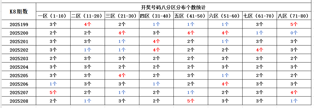 首先看上期回顾,“快乐8”第25208期开奖结果:8.10.19.24.28.29.33.38.41.44.45.48.50.52.55.58.63.67.68.78;通过分析开奖号码,分享第一个数据分析:统计开奖号码的八分区冷热走势,判断出号规律。以近10期开奖号码的八分区统计数据为例: