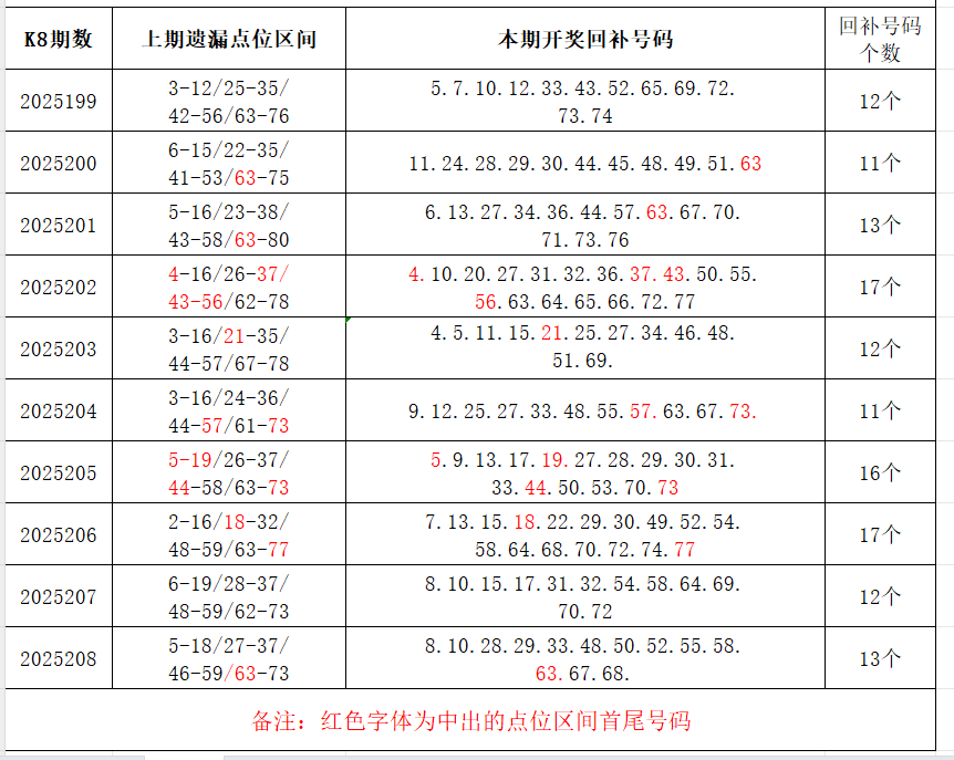 如图,上期的遗漏号码在下期开出10个左右,即为回补号码。定准点位区间首尾号码是关键!以上期2025208期(会员专区数据)为例,定位4个遗漏区间,围中13码!结合上期开奖号码,以跨度值大于或等于7为依据,本期关注3个遗漏区间:1-8/10-19/68-78;重点关注遗漏-区间:****(会员专区可见),区间遗漏号码可能在本期回补开出。注意区分遗漏区间回补号码和大底号码,不要混淆。个人分析,仅供参考。