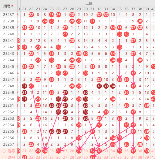 二区在近期的走势上分析,而且整个区间现在是一个温冷形态,上期二区间再次开出了4码,而且整个区间上期开出的形态是空位回补和重码走势,上期小妹在文章布局到了2码开出,那么本期二区间首先注意重码上的22.36.34. 中开出走重一码机会,而重码回补上注意30932.39.40中参考一码回补即可,至于对称形态上的26.29.35.中开出一码机会,而梅花形态上的35号本期有机会,要做参考机会,如图所示.