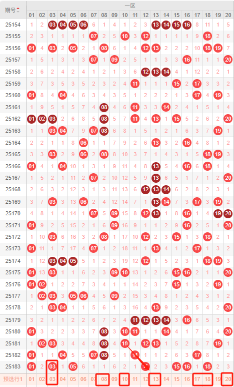 一区:最近一区10期出号情况为:6 7 4 5 4 5 6 7 6 7,总出号情况为56个,平均出号5.6个,本期推荐一区号码回补推荐出号为:03 08 10 13 17 18 20。重点关注:03 08 13 17 20。