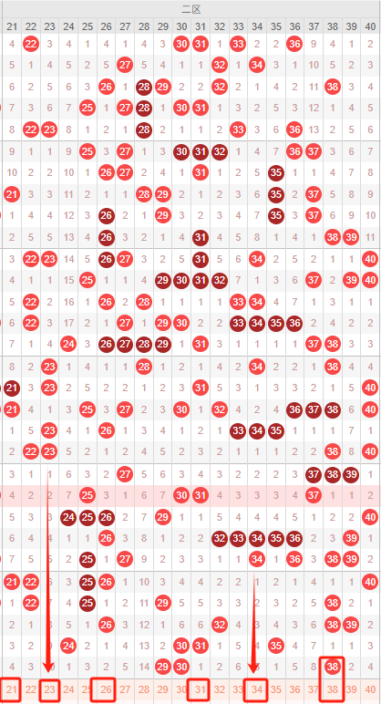 二区:最近二区10期出号情况为:4 4 5 6 6 5 4 4 4 3,总出号情况为46个,平均出号4.6个,本期二区号码还是比较弱势推荐:21 23 26 31 34 36 38 。重点关注:21 23 34。