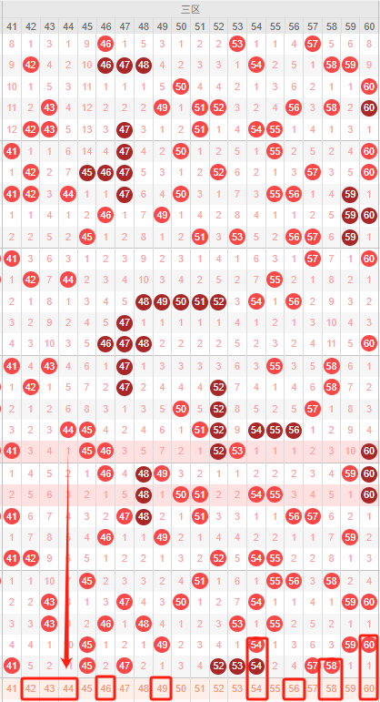 三区:最近三区10期出号情况为:5 6 6 3 5 5 6 5 5 8,总出号情况为53个,平均出号5.3个,本期三区号码走势比较不错推荐:42 43 44 46 49 54 56 58 60。重点关注:54 56 58 60。