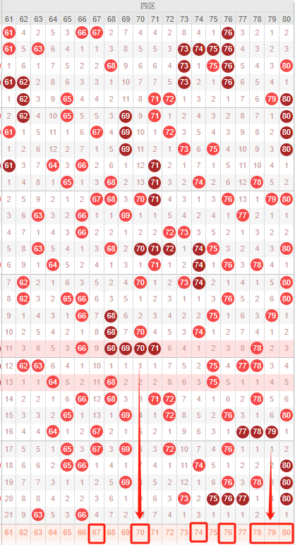 四区:最近四区10期出号情况为:5 3 5 5 5 5 4 4 5 2,总出号情况为43,平均出号4.3个,本期四区号码推荐:67 70 74 76 78 79 80。重点关注:67 70 74 78 79 80。