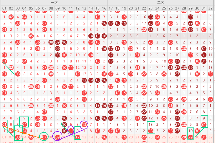 二区胆尾2尾,3尾,2尾这么热断2期看好今天回补22,今天有隔2期号只有19 21 22 25符合,优先选热尾19 22,近期隔一期没断本期只有28 31,二选一看热尾选28,在热区选号优先看热尾核心思想,冷号连出2期本期只有一个号29,29是三斜连形态上图已经勾画,龙头看好1开头要出号17 18 19三选一,7尾最热看17其次18 19,重号看23,连号不断看22 23,本期二区关注六码17 22 23 28 29 31