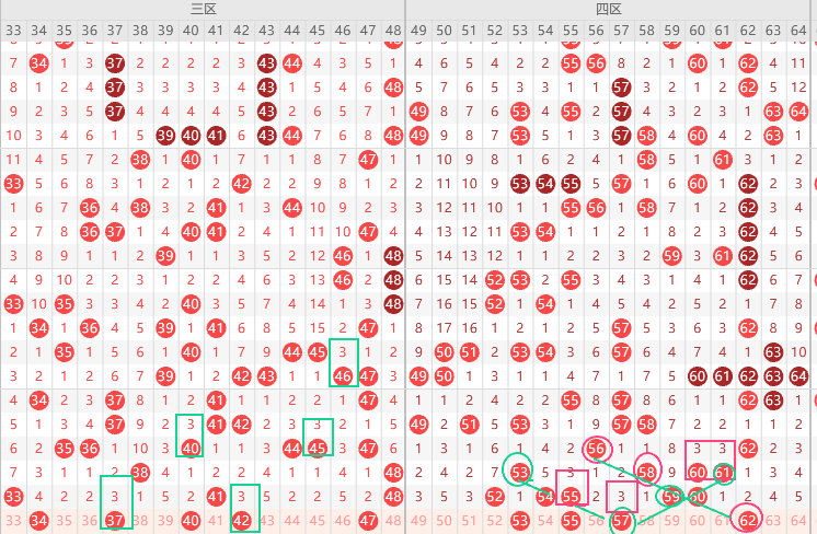 四区胆尾2尾,62形态上斜连号上图已勾画,不喜欢62试试52,本期是有重号的52也可以,57形态也很漂亮,双斜连号,上图已勾画,58形态也号是三斜连形态,58 59 60组成斜连号,上期重号回补本期看好55 58出一码,边号看51 53 58 59出一码,本期关注六码53 55 57 58 59 62