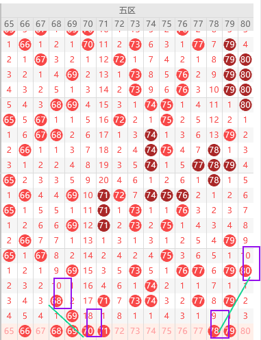 五区胆尾8尾0尾,上期就出一个号,边号没断,那么本期只关注三码,69边号只有68 70二出一,70最合适,近期隔一期出一个冷号上图已勾画,本期只有两个70跟78,形态上70跟68 69组成三斜连号,上图已勾画,同样78是冷号也是三斜连形态,78 79 80组成三斜连上图已勾画,其次看好66到出号周期,重号如果回补就是69,本期关注六码66 68 69 70 71 78