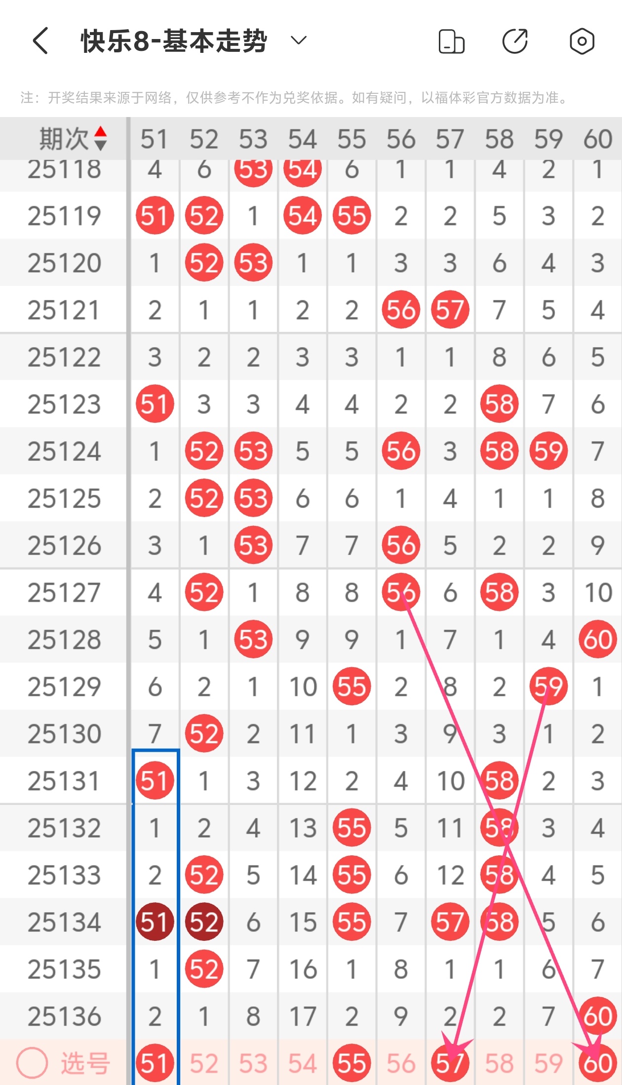 上期第六区间开出60,本期我们可以从上面走势图中看到选号的思路,本期推荐51 55 57 60