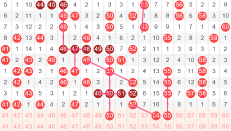 第三区间的龙头位置号码都很好,选择困难症,所以我直接不选了,你们有看好的就打,这里我直接看5字头的50隔期回补,复制形态有机会走出。然后关注冷码54今天一样 有机会下落,还有55的复制形态一样很漂亮可做,尾部就看56  58二选一出一码,我比较喜欢58.第三区间可推荐的选二搭配组合有54  55或者10  50,第三区间胆码主看50  55 58