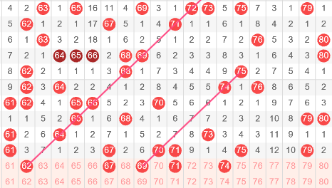 第四区间首先看龙头位置的边码62的长斜连对称形态,今天有机会下落可以做一手,防守64号码球,看67的重码,以及69的对称形态,然后70  71二选一出一个,我比较喜欢71.最后看边码74的下落,然后防守80即可,该区间可推荐的选二搭配组合有69 71,第四区间胆码主看69  71  74