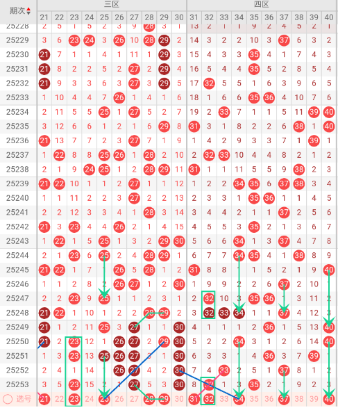 四区开出:32,35 奇偶比: 1:1 和值:67 跨度:3,上期开出2个号码,奇偶数号码均衡。本期三斜连走势:31,隔码斜连走势:34,近10期平均出号2.3枚。本期推荐关注号码:32、34、37、40。