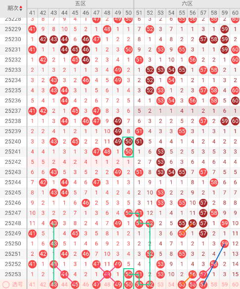 五区开出:44,48,50 奇偶比: 0:3 和值:142 跨度:6,上期开出3个号码,偶数号码占优势。本期三斜连走势:45 47 49,无隔码斜连走势。近10期平均出2.2枚,本期推荐关注号码:43、45、49、50。