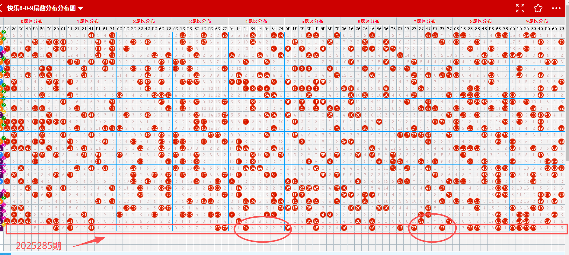上图是快乐八2025285期的尾码走势图,从图中看0尾到9尾出号个数依次是:0尾号码区开出1个;1尾号码区开出2个;2尾号码区开出0个;3尾号码区开出2个;4尾号码区开出1个;5尾号码区开出2个;6尾号码区开出2个;7尾号码区开出3个;8尾号码区开出3个;9尾号码区开出4个;再看小尾号码(0尾-4尾)区有6码,大尾号码(5尾-9尾)有14码;数据比对统计后可以看到本期9尾出号数量最多,一共开出了4个中奖号码。本期2尾出现断区!由走势比对推断2025286期重点需要关注4、6、7尾区号码下号热度回补和落号数量增加的概率较大。