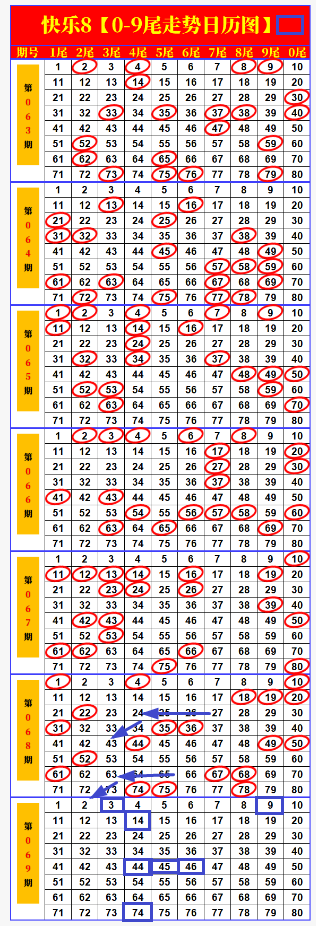 本期画线思路概括:这次尾号走势图画线比上期应该好看一些,因为70以后的数字开出来了,对于延伸选号就有很大的帮助。根据箭头提示的画出来03.09搭配组合,对于规律号码不适宜选择过多,否则容易掉进沟里去。通过对03的延伸,继续追热尾号14.44.74组合,值得关注是上期两两连号组合特别多,本期应该还是会延续这种方式,所以大胆猜测44.45.46连号组合。