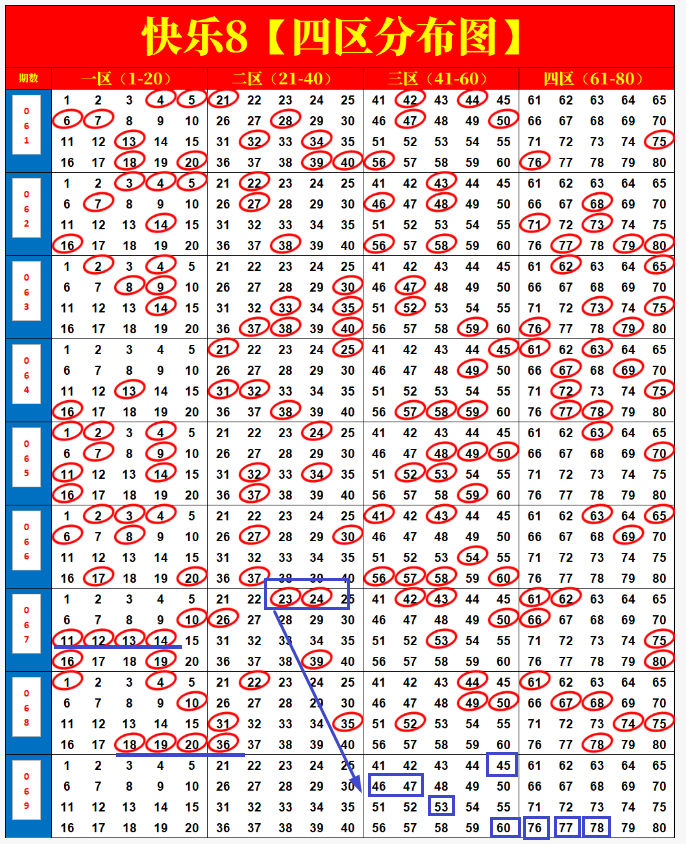 对于快乐8的选号,我着重从四个方面下手,分别是历史同期开奖结果走势、热尾号、四个区间走势。