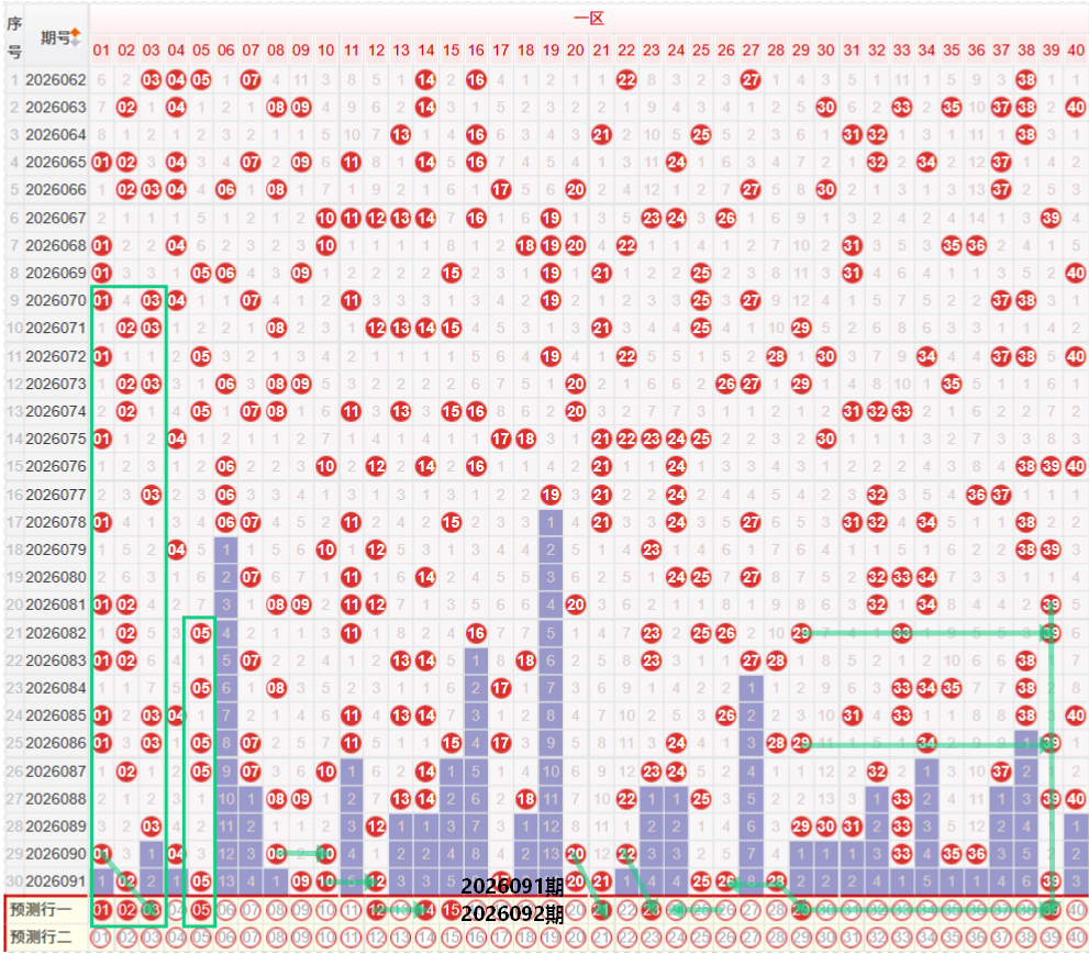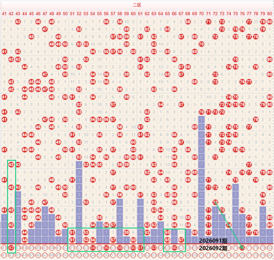 如图所示:在本期大数区的选号中注意在上期的走势中三区间开出了6枚中奖号码,落号数量保持在均值走势,上期再次出现多码的连续走势,开出了51 54 57 60的同路四码走势,本期注意下方可能会再次出现单形态的多码走势,个人较为看好偶数的多码走势,关注54 56 58 60尾部位置注意连号走势,前段内置上期开出了44的重号走势,本期注意39 42的交替走势,上期开出44之后,本期考虑向前延续42的偶数走势相对较为合理,四区间上期开出了2枚中奖号码,出现了断7字头的走势,本期注意76的均线回补走势,前段位置注意66的夹号走势,以及近期较为热门的61 63 66多码走势,或者是66 68的偶数二连走势。