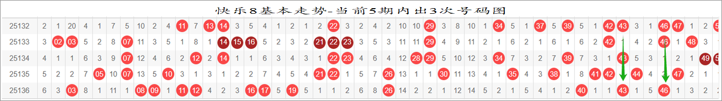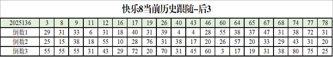 我感觉选热的同时,还要注意防冷条件开出,可以直接选取每个号码跟随出次前三的号码,也可以考虑把出次最后的三个数字加进去,不过这样可能号码太多,可以尝试。图上也能看出单独号码跟随的情况,我就不一一统计每个号码的出次了,我这里考虑提高概率,取每个号码历史跟随的前三号码和后三号码,根据2025136期的号码,我关注正数3和倒数3的号码号码为: