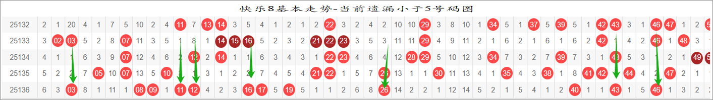 所以这个条件值得关注,从号码分布图上我们可以分析出,遗漏小于5期的号码有: