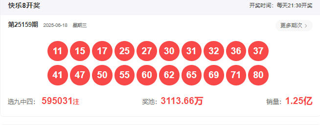 开奖号码:11 15 17 25 27 30 31 32 36 37 41 47 50 55 60 62 65 69 71 80