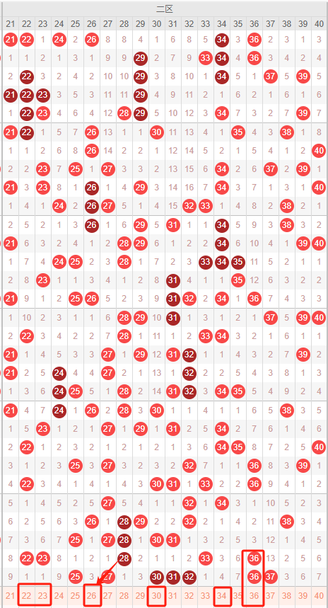 二区:最近二区10期出号情况为:6 5 4 5 5 3 5 5 5 7,总出号情况为50个,平均出号5个,本期二区号码还是比较弱势推荐:22 23 26 30 34 36。重点关注:22 23 26 30 34 36。