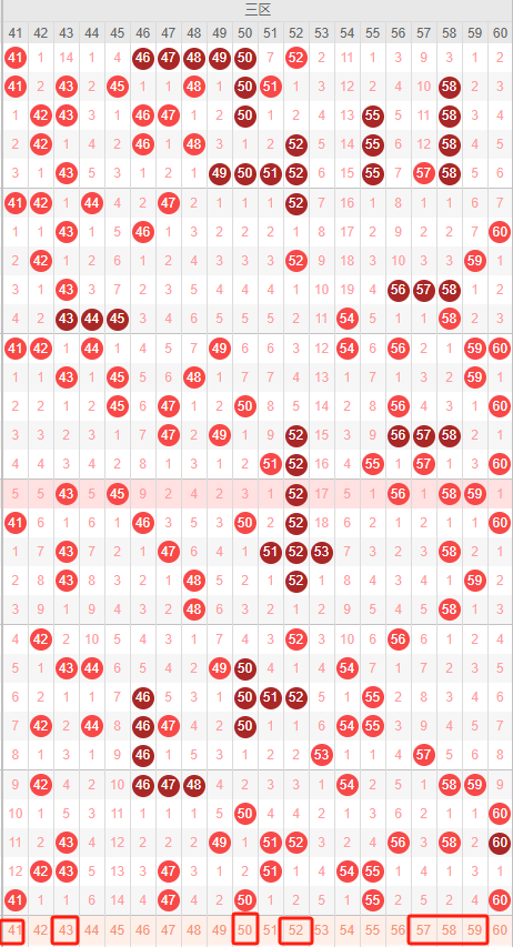 三区:最近三区10期出号情况为:3 5 5 7 3 7 2 7 6 5,总出号情况为49个,平均出号4.9个,本期三区号码走势比较不错推荐:41 43 50 52 57 58 59。重点关注:41 43 52 57 58 59。
