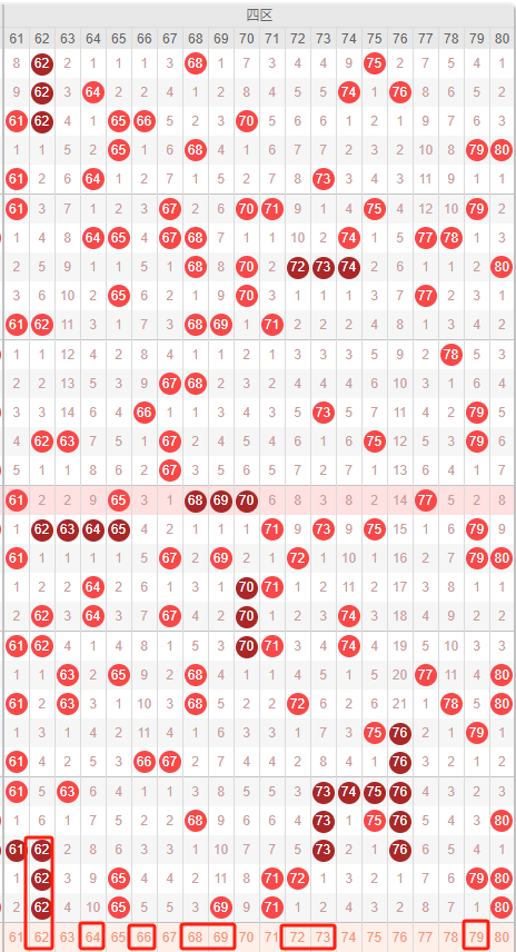 四区:最近四区10期出号情况为:5 5 6 3 4 6 5 4 6 5,总出号情况为49,平均出号4.9个,本期四区号码推荐:62 64 66 68 69 72 73 79。重点关注:64 68 72 73 79。