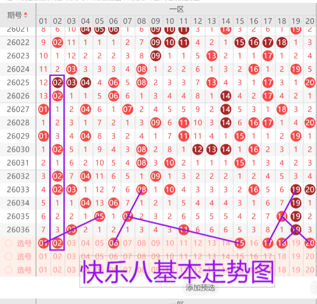 我们来看下一区的基本走势情况,上期开出了三枚开奖号码,本期预计开出4-5枚开奖号码,首先我们来看01的奇数三斜连走势形态,02的重号空三上下对称走势。06的三斜连考虑重点防守。15的三斜连。17的三斜连。19的分边18 20双码建议考虑15 17 18 20四码四选二或者四选三。