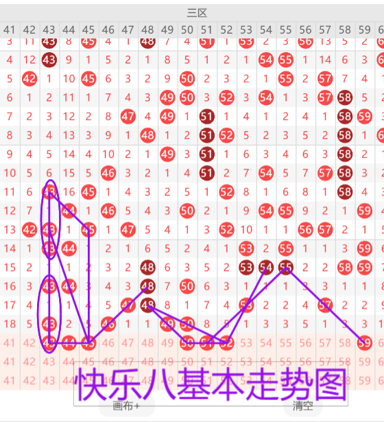 我们来看下四区的基本走势情况,上期开出了四枚开奖号码,本期预计开出3-4枚开奖号码,首先我们来看43的空一走重的上下对称走势,45的四斜连。43 44 45的三斜连有没有可能走成直连堵漏形态,建议防守。50 51 52的三二一走势形态。51 52的交叉二连。或者考虑59的奇数空一三斜连收尾走势。