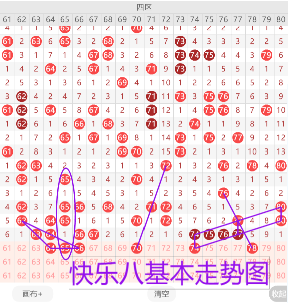 我们来看下四区的基本走势情况,上期开出了八枚开奖号码,本期预计开出4-6枚开奖号码,首先我们来看64 65 66的三二一走势加堵漏形态。70的空区回补三斜连。74的同路三斜连,78的三斜连。74 78二选一,考虑缺角形态则优先选择78.