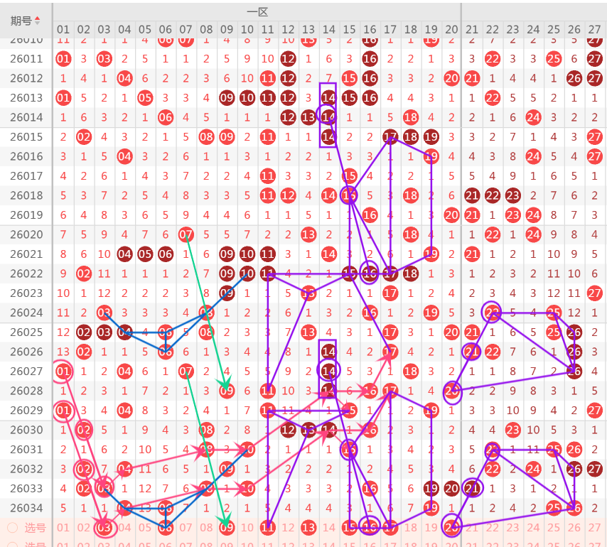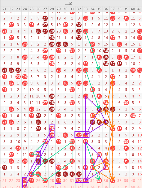 二区上期开出6个号码,两处连号,注意重号的选择和分边号码的选择,首先重号包括25-29-32可关注,19-29三重号二选一,分边24-27落位二选一,可防32-33同出,注意36分边下落号码35-37可二选一.重点关注37.