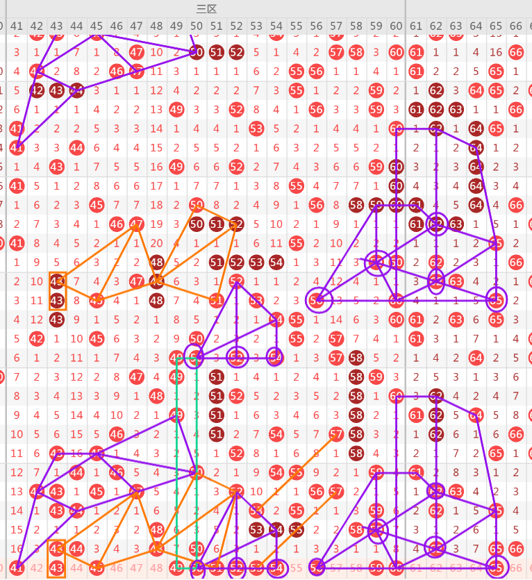 上期三区开出4个号码,本期注意5码左右回补,重号关注43-50,41属于最大遗漏复制形态走势,持续关注,拿不准可不做重点,防.43-45防同出的可能,49-51属于50分边都是温冷号,注意二择一的选择.看好51的开出,52-56属于空位回补号码遗漏三期,二选一即可.53-54-59属于遗漏一期回补空位号码,有开号机会,重点择一.
