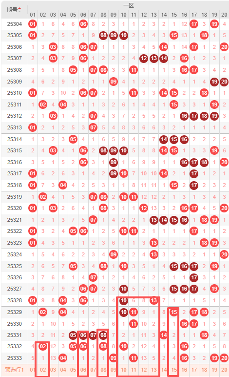 一区:最近一区10期出号情况为:3 7 2 7 5 7 3 6 6 6,总出号情况为52个,平均出号5.2个,本期推荐一区号码回补推荐出号为:02 06 08 10 11 12 13 15。重点关注:02 11 13 15。