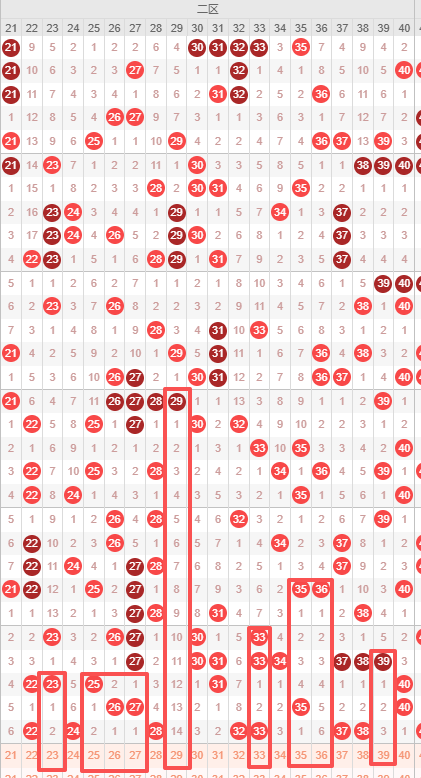 二区:最近二区10期出号情况为:4 4 5 7 4 5 8 5 4 7,总出号情况为53个,平均出号5.3个,本期二区号码还是比较弱势推荐:23 25 26 27 29 33 35 36 39。重点关注:25 26 27 35 36 39。