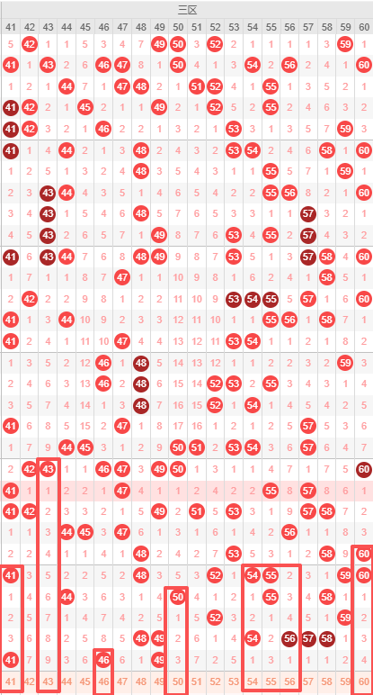 三区:最近三区10期出号情况为:7 4 7 4 4 7 4 2 6 3,总出号情况为48个,平均出号4.8个,本期三区号码走势比较不错推荐:41 43 46 50 54 55 56 60,重点关注:41 46 50 54 56 60。