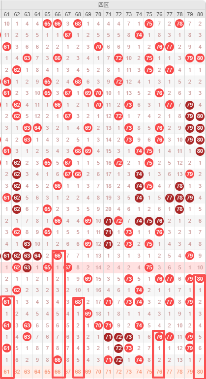 四区:最近四区10期出号情况为:6 5 6 2 7 1 5 7 4 4,总出号情况为47个,平均出号4.7个,本期四区号码推荐:61 66 68 76 80。重点关注:61 66 68 76。