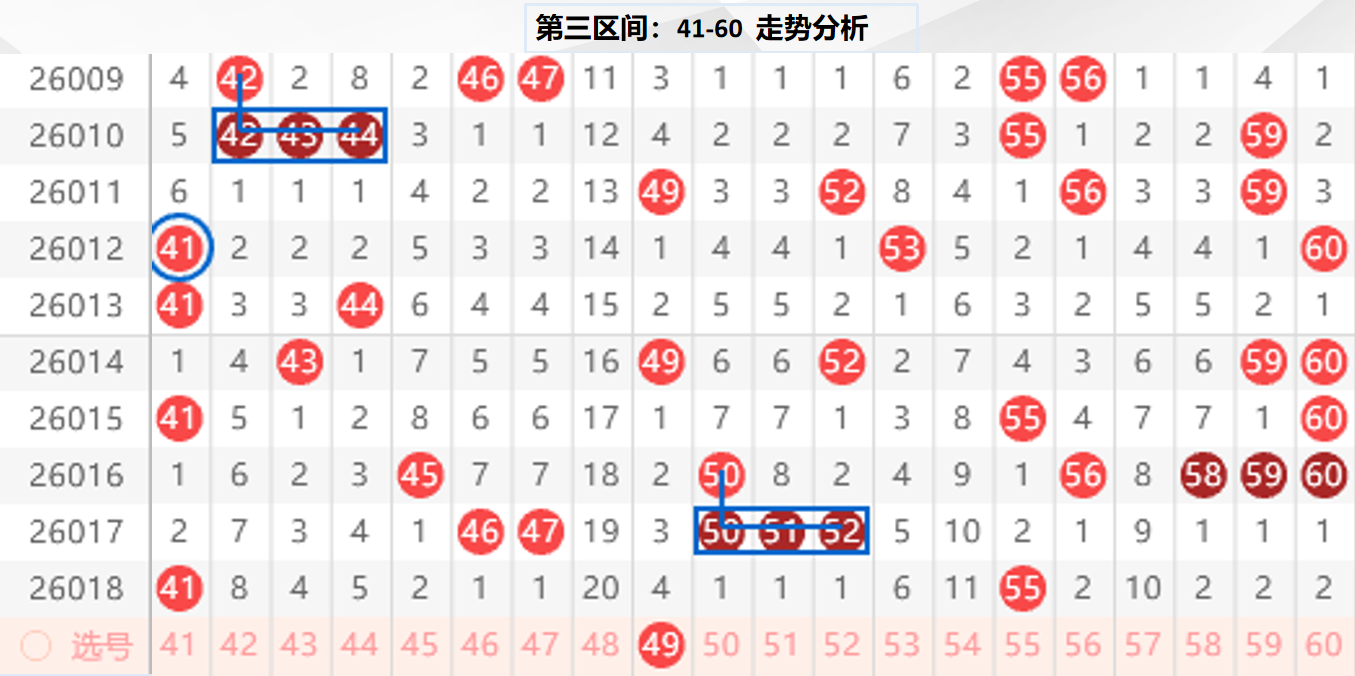 三区分析:【41-60】(走势图标注号码非小黄车大底,请谨慎参考,具体思路将在直播间分享讨论)