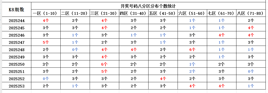 首先看上期回顾,“快乐8”第25253期开奖结果:3.10.20.23.27.30.32.35.44.48.50.51.53.56.57.63.65.68.70.72通过分析开奖号码,分享第一个数据分析:统计开奖号码的八分区冷热走势,判断出号规律。以近10期开奖号码的八分区统计数据为例: