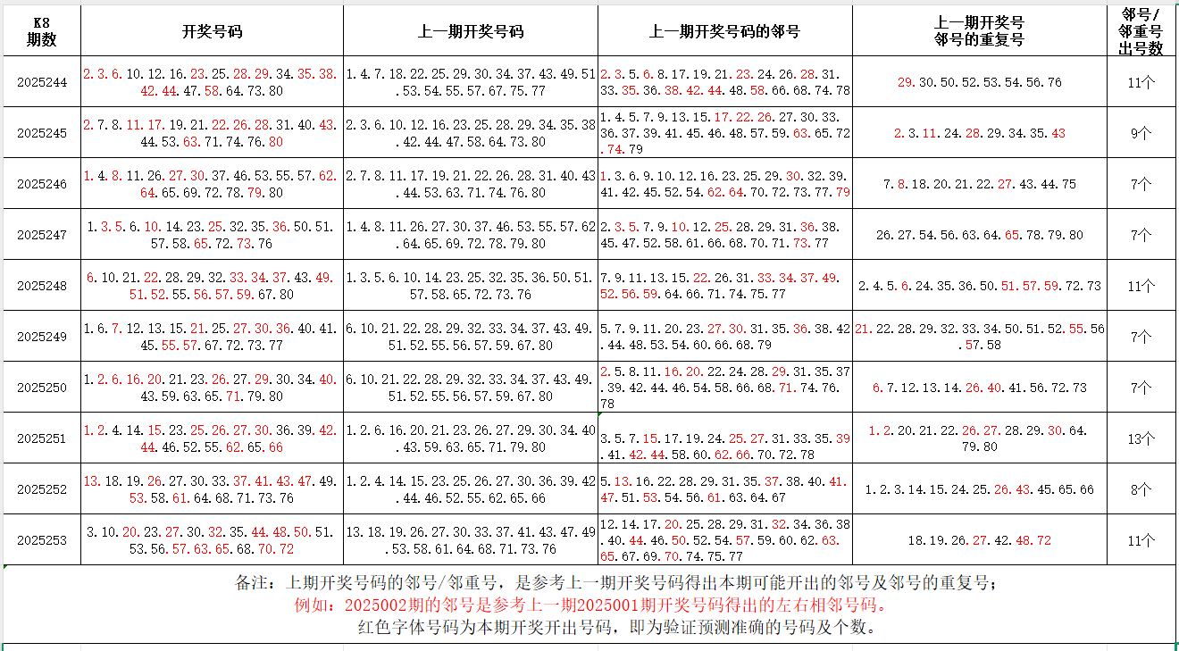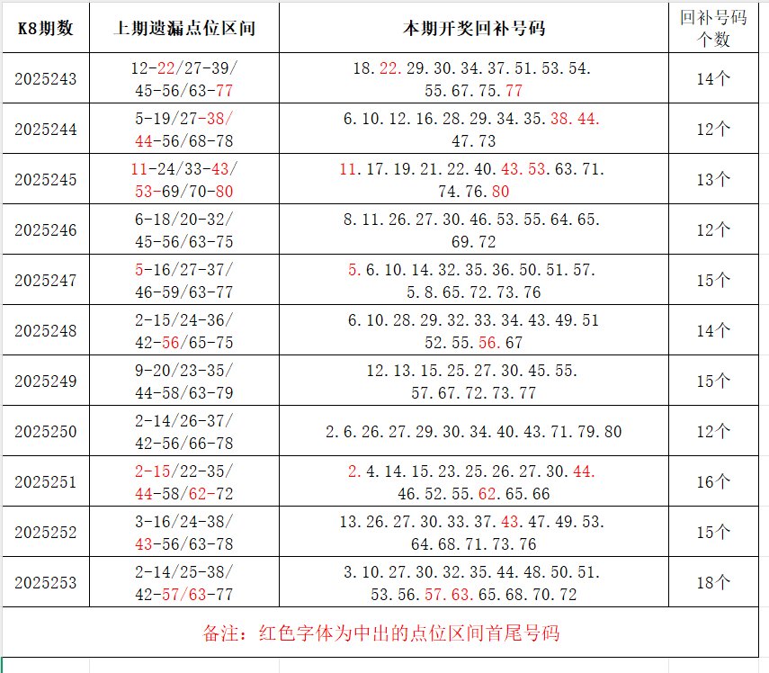 如图,上期的遗漏号码在下期开出10个左右,即为回补号码。定准点位区间首尾号码是关键!以上期2025253期为例,定位4个遗漏区间,围中18码!结合上期开奖号码,以跨度值大于或等于7为依据,本期关注3个遗漏区间:3-10/10-20/35-44;重点关注遗漏区间:2-14/25-38/42-57/63-77,区间遗漏号码可能在本期回补开出。注意区分遗漏区间回补号码和大底号码,不要混淆。个人分析,仅供参考。